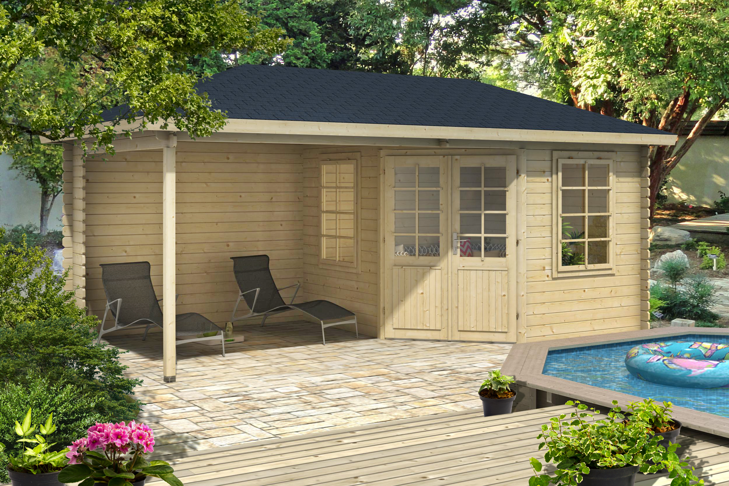 W rogu budynku znajdują się duże przeszklone dwuskrzydłowe drzwi wejściowe. Na bokach, po obydwóch stronach drzwi są umieszczone dwa uchylne okna. W podstawowej wersji domku zadaszony taras znajduje się z lewej strony, niemniej jednak na życzenie taras może zostać umieszczony z prawej strony budynku. Domek będzie doskonałym miejscem na spędzenie czasu w towarzystwie rodziny albo przyjaciół, a zadaszony taras pozwoli na spędzenie większej ilości czasu na świeżym powietrzu.