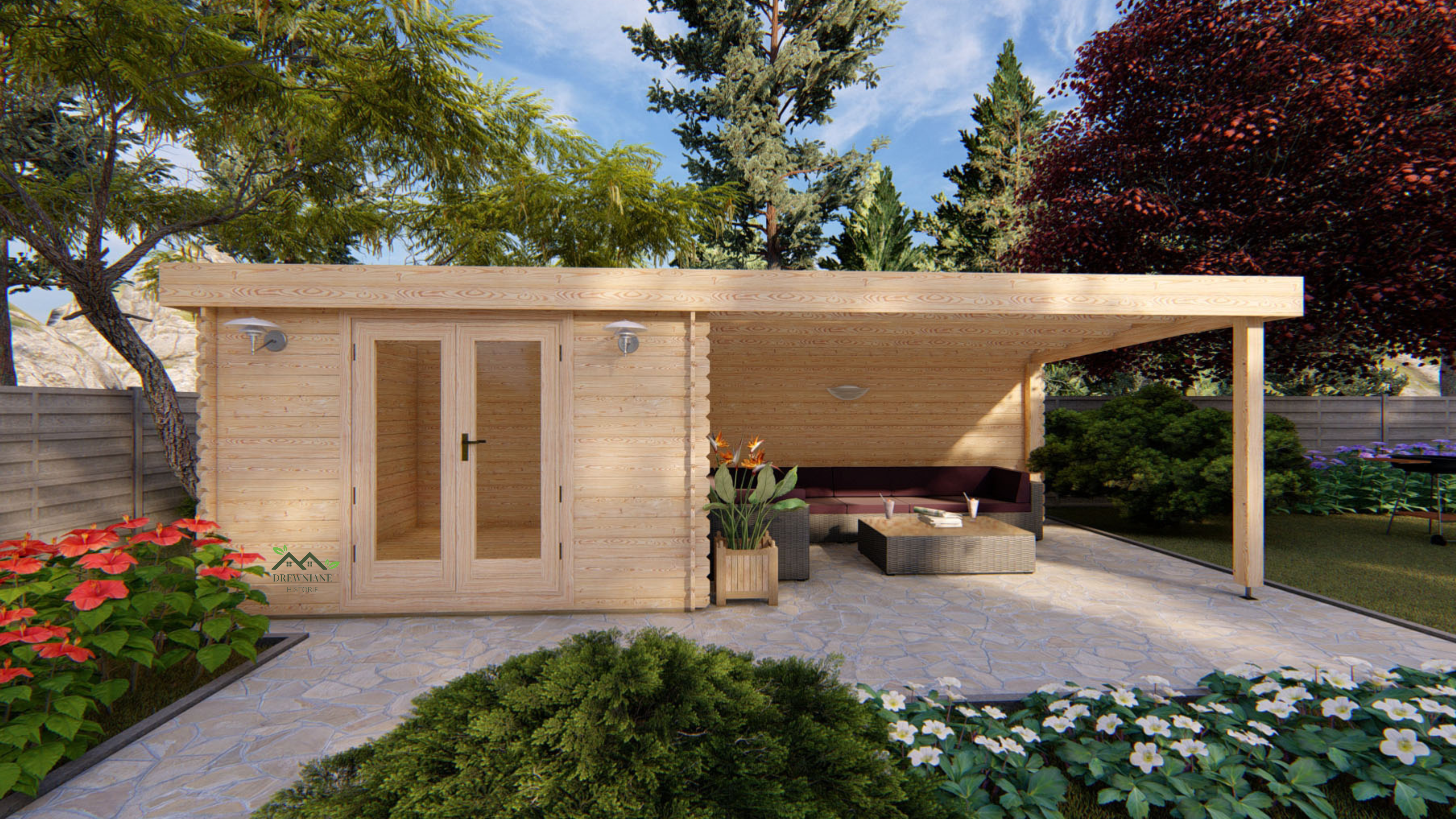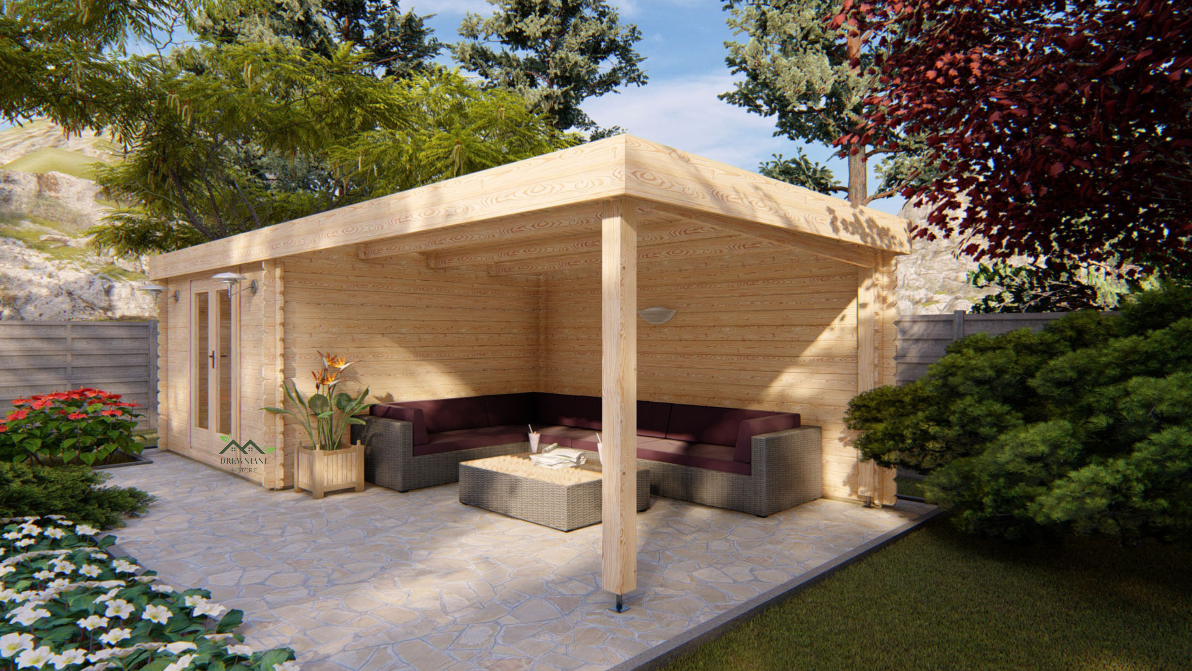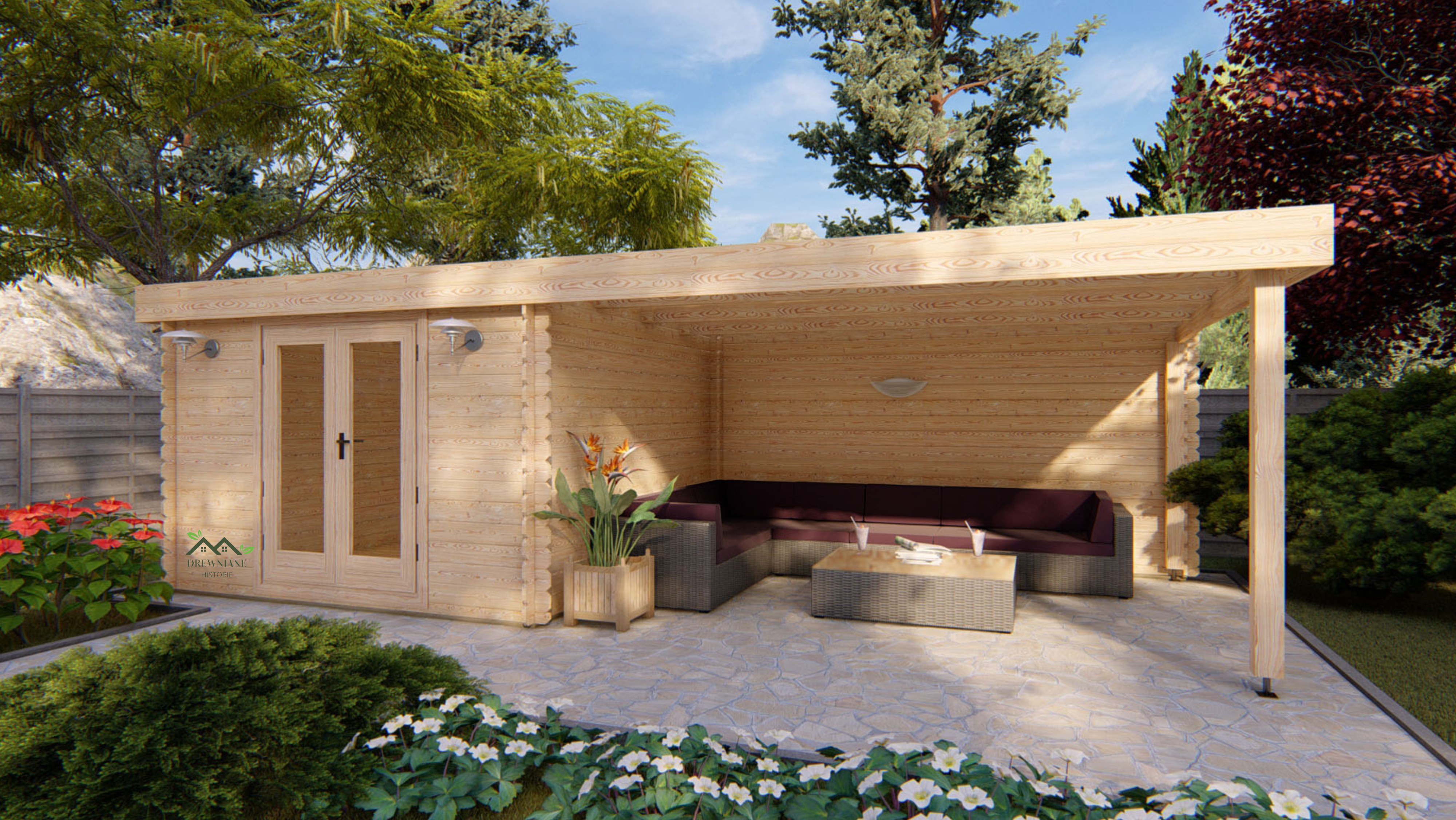Domek ogrodowy Erik to ponad 7-metrowa drewniana konstrukcja podzielona na zamykane dużymi podwójnymi drzwiami pomieszczenie użytkowe o powierzchni 9,3 m2 wraz z dodatkowym zadaszonym ponad 12 m2 tarasem