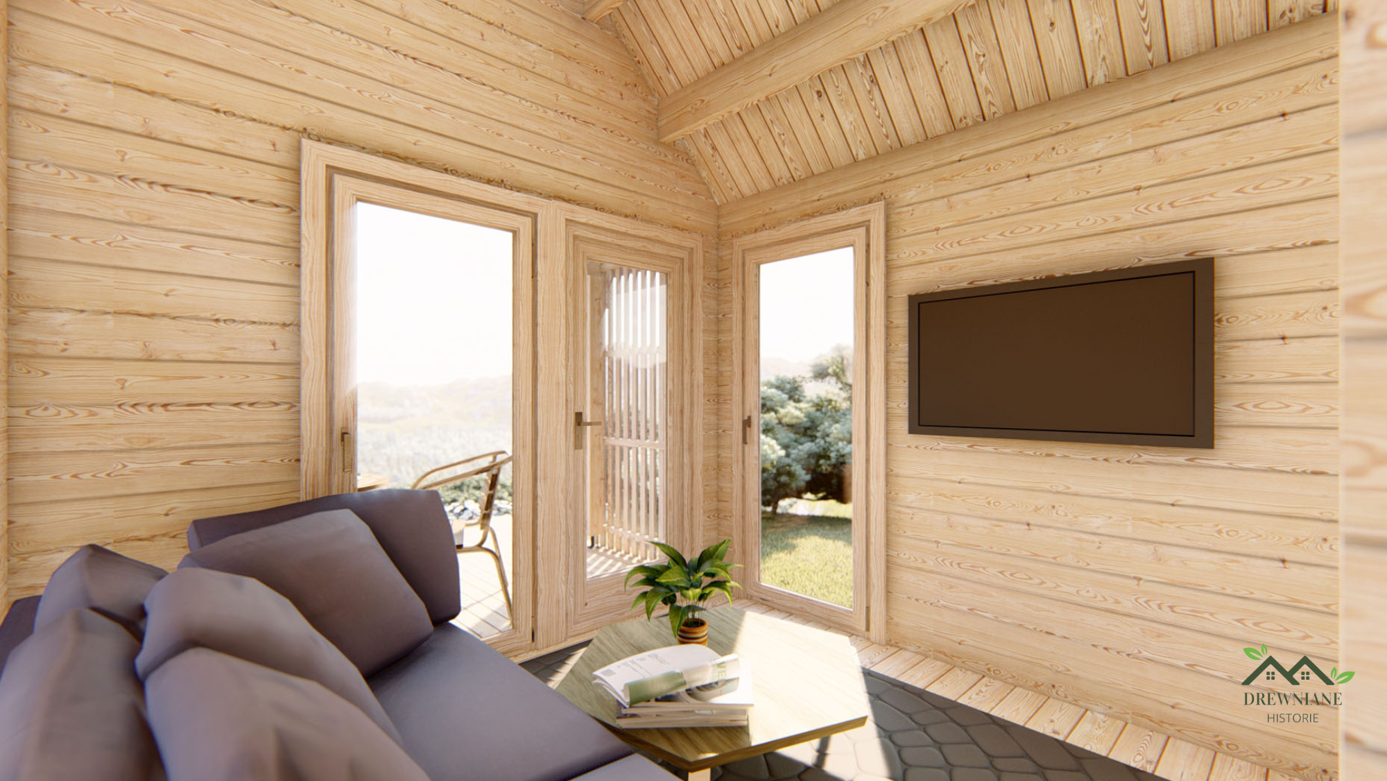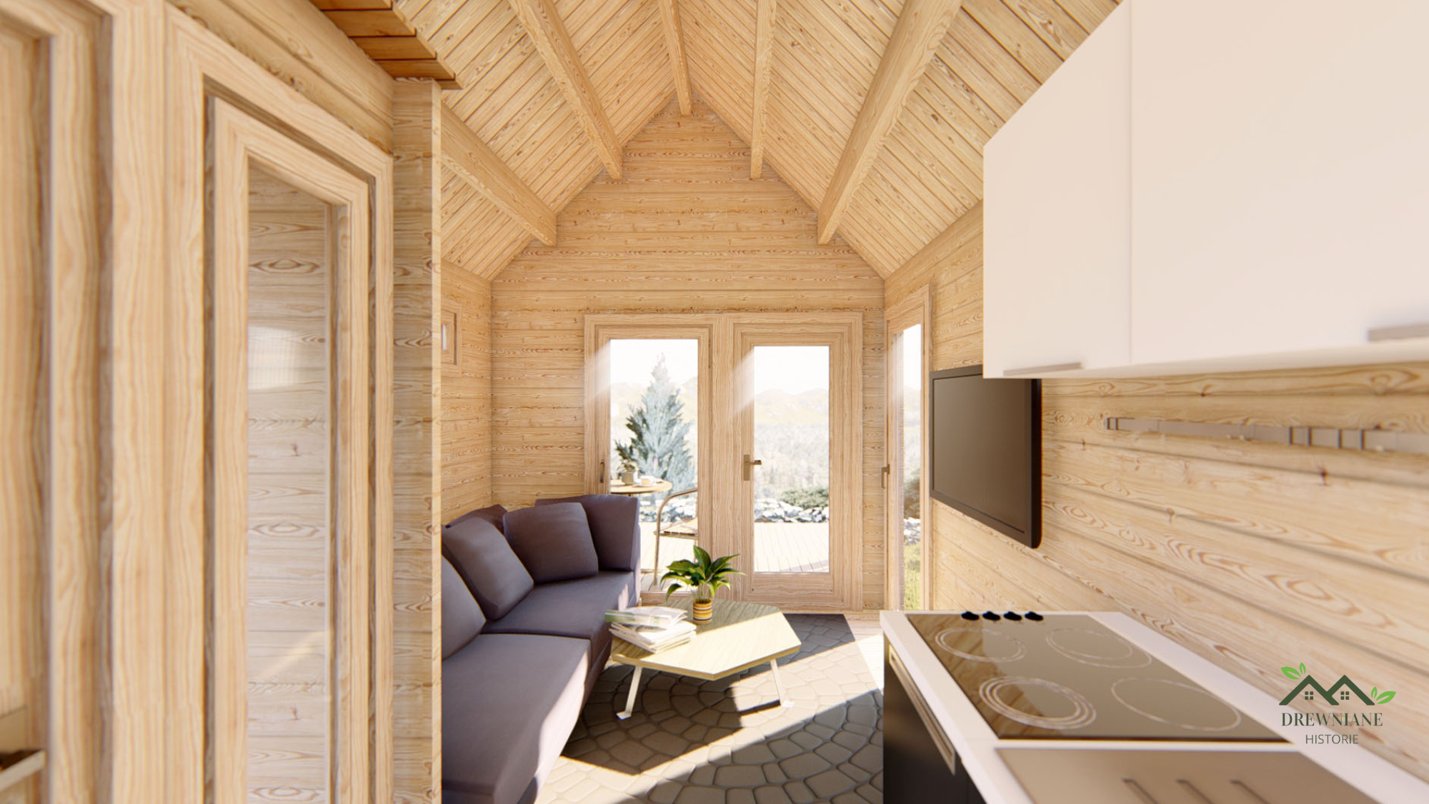 Ten mały bungalow charakteryzuje się eleganckim stylem i wyjątkowym wystrojem z zadaszonym tarasem, dużymi oknami i drzwiami, które wpuszczają dużo naturalnego światła. Idealny do przytulnego wypoczynku w ciepłym sezonie.