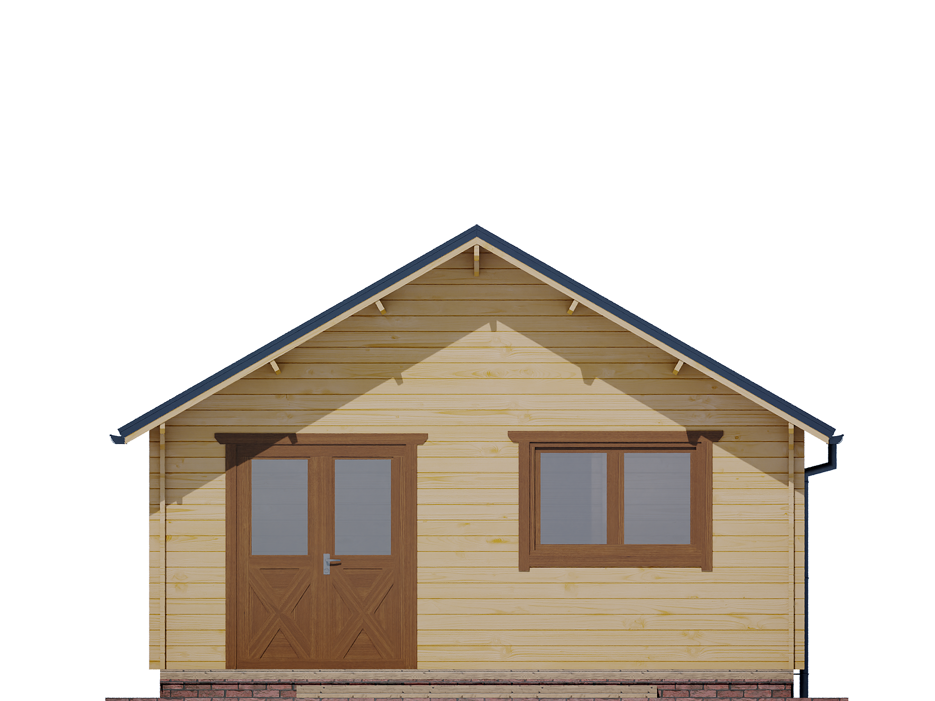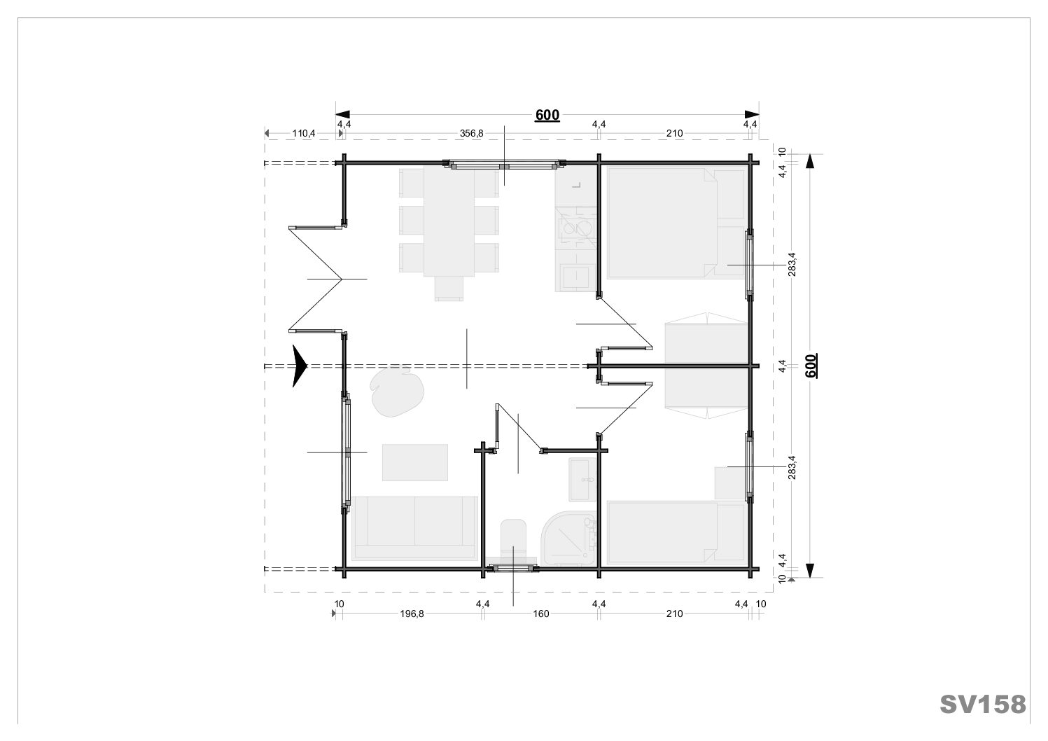 Jego wymiary zewnętrzne, bez elementów wystających i tarasu, wynoszą 580×580 cm, co daje powierzchnię zabudowy 33,6 m2. Ściany domku wykonane są z 44 mm litego bala świerkowego, co zapewnia stabilność konstrukcji. Dwuspadowy dach z 110-centymetrowym wypustem doskonale chroni drzwi wejściowe przed deszczem i nadaje budynkowi charakteru.