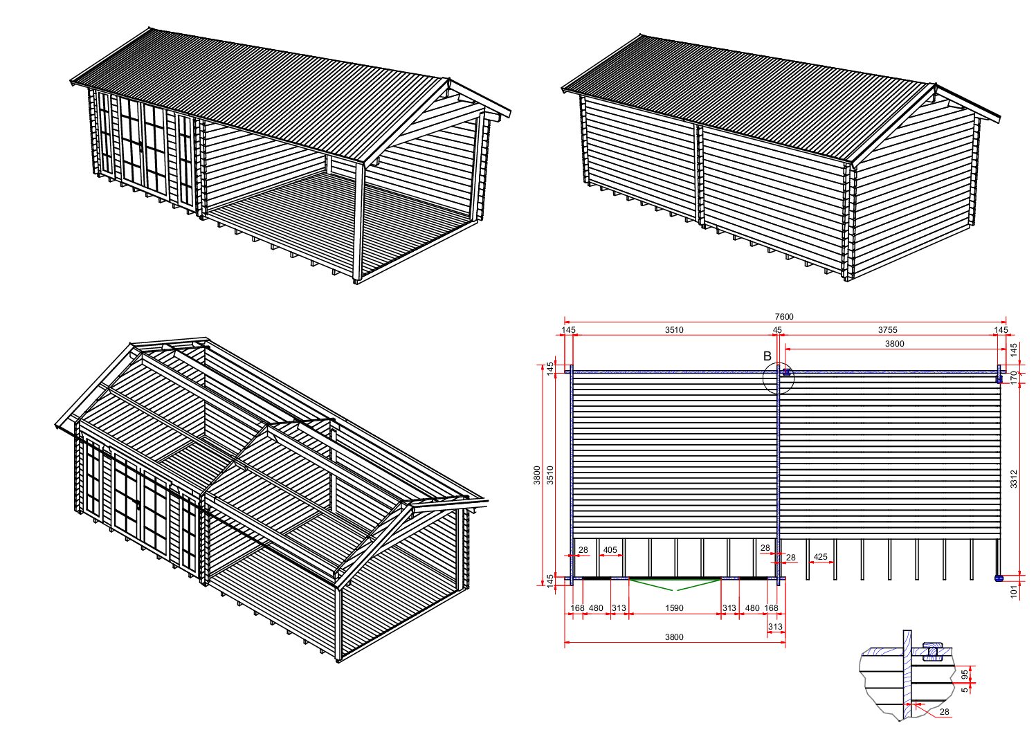 Całkowite wymiary zewnętrzne domku Igor II wynoszą 760×380 cm, bez wystających elementów. Powierzchnia mieszkalna to 380×380 cm, co daje 12m² użytkowej przestrzeni. Ściany wykonane są z bali świerkowych o grubości 45 mm, podłoga z deski o grubości 28 mm, a dach z 18 mm paneli. Prosta konstrukcja i dobre dopasowanie elementów, przy odpowiedniej konserwacji, zapewniają długotrwałe użytkowanie.