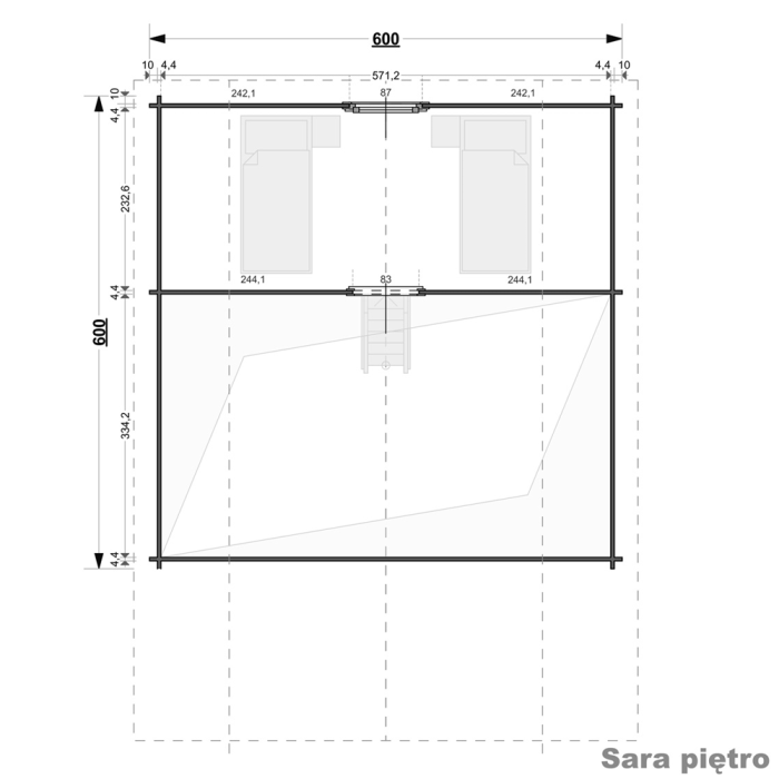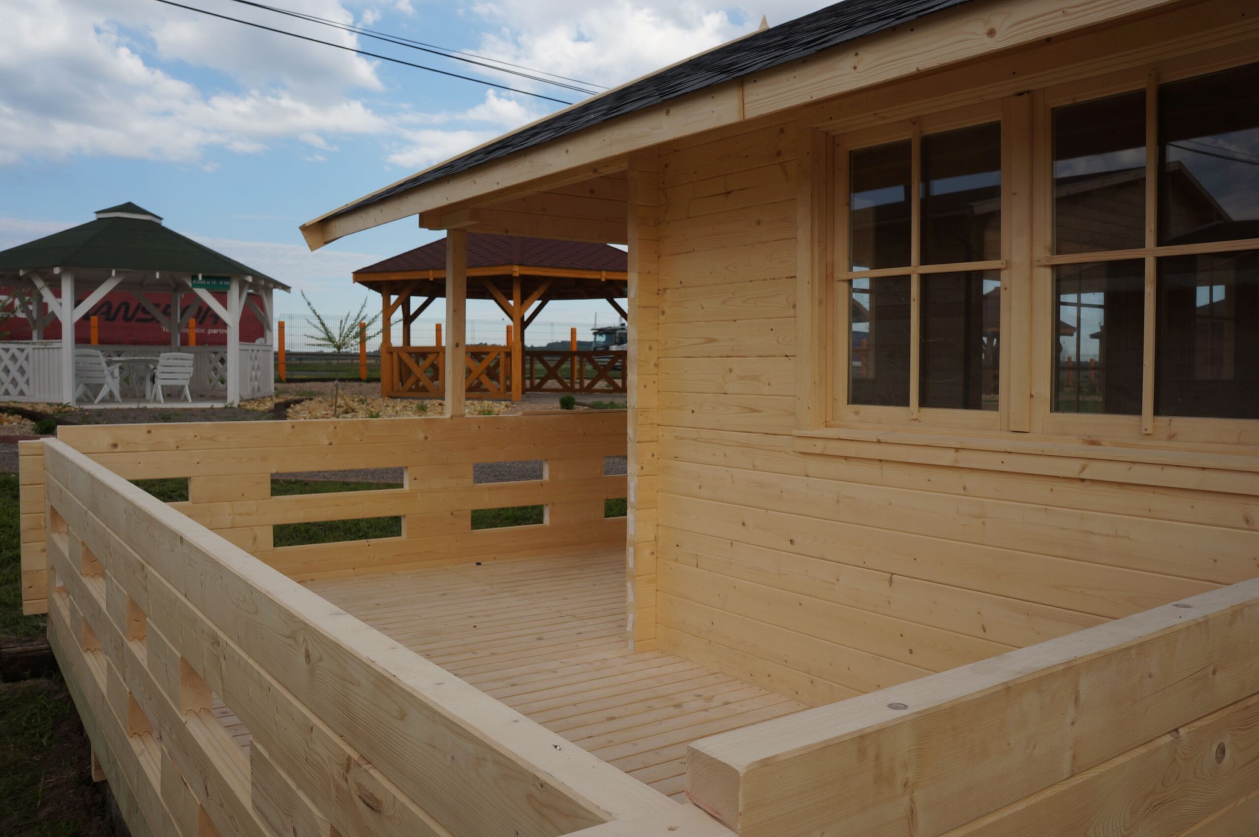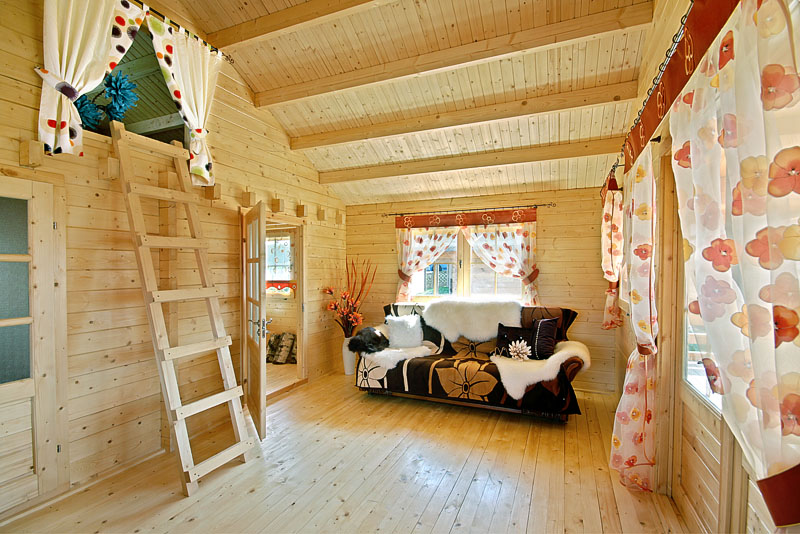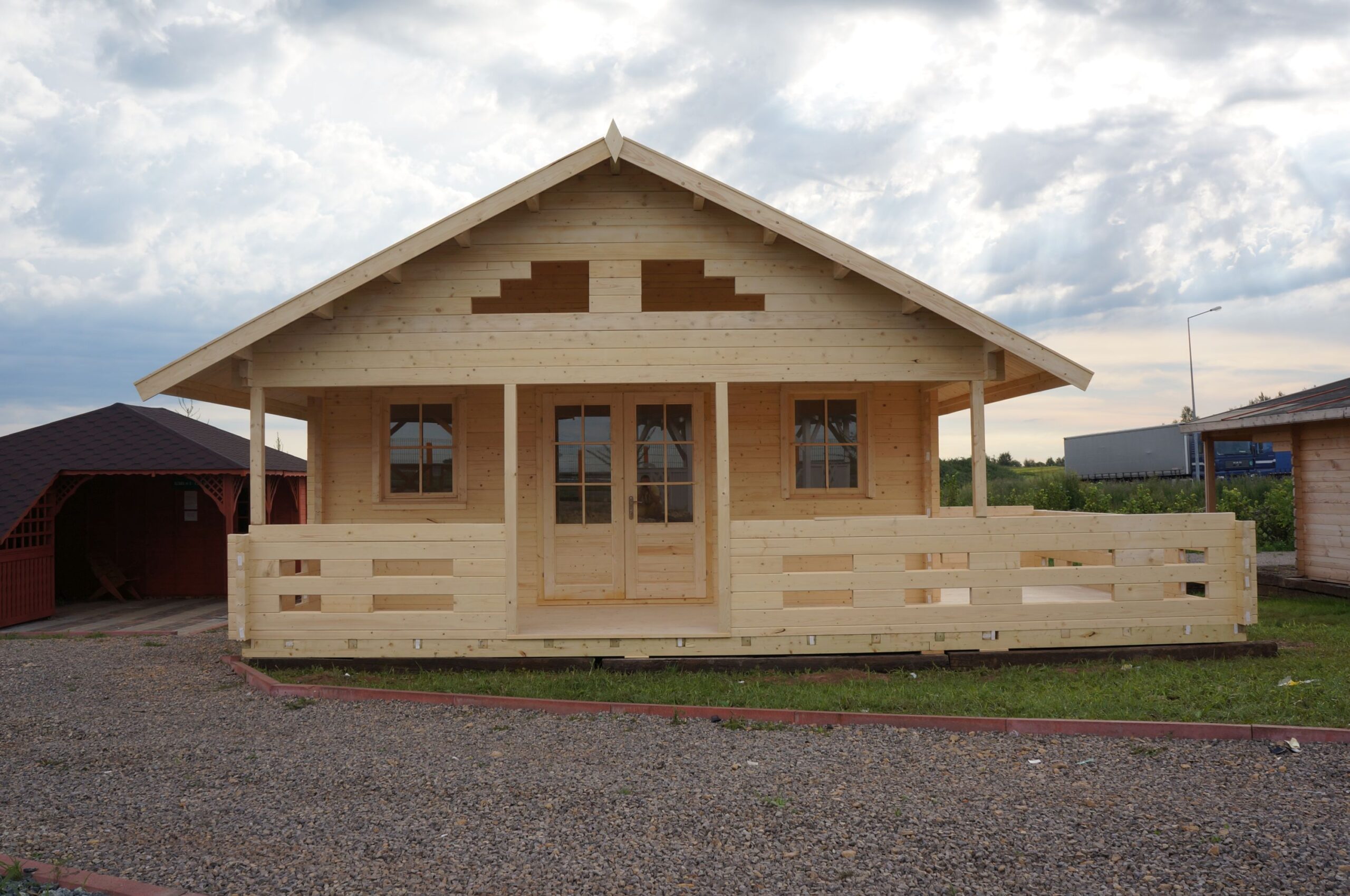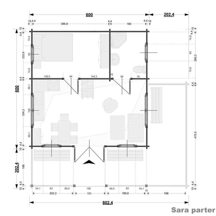 Sara to duży drewniany domek letniskowy o prostokątnym kształcie z tarasem w kształcie litery L. Doskonale nadaje się do wynajmu w ośrodkach wczasowych lub jako letni domek na działce nad jeziorem czy w górach. Trzy pomieszczenia oraz antresola sprawiają, że jest bardzo uniwersalny i umożliwiają dowolną aranżację wnętrza. Co ważne, do budowy domku nie potrzeba pozwolenia na budowę.
